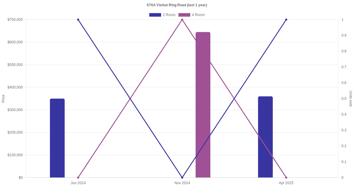 Below is a quick summary of the resale transactions volume and average price trends for the 2 room and 4 room units at 676A Yishun Ring Road.