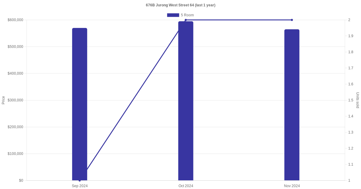 | Nov 2024 | $590,000 | $5,364 | 5 Room | Blk 676B Jurong West Street 64 5 Room / 110 sqm | 10 to 12 | 110 sqm | Premium Apartment | 2008 |