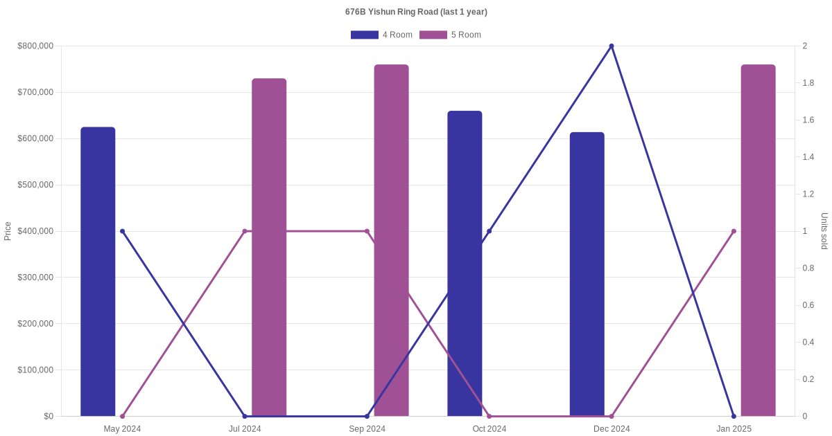 Below is a quick summary of the resale transactions volume and average price trends for the 4 room and 5 room units at 676B Yishun Ring Road.