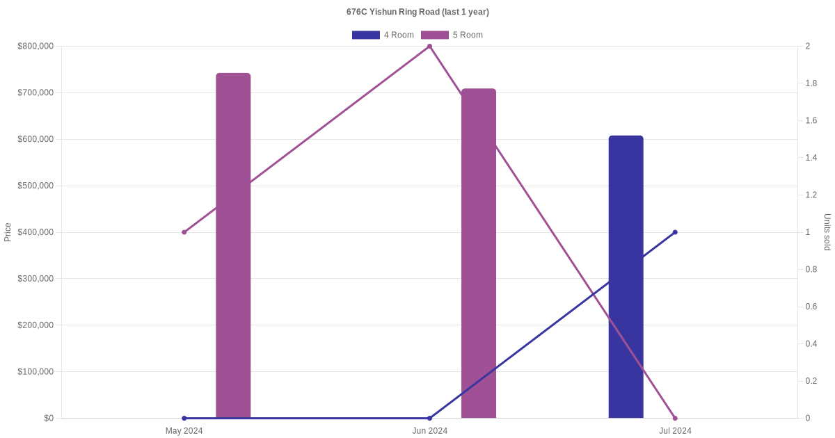 Below is a quick summary of the resale transactions volume and average price trends for the 4 room and 5 room units at 676C Yishun Ring Road.