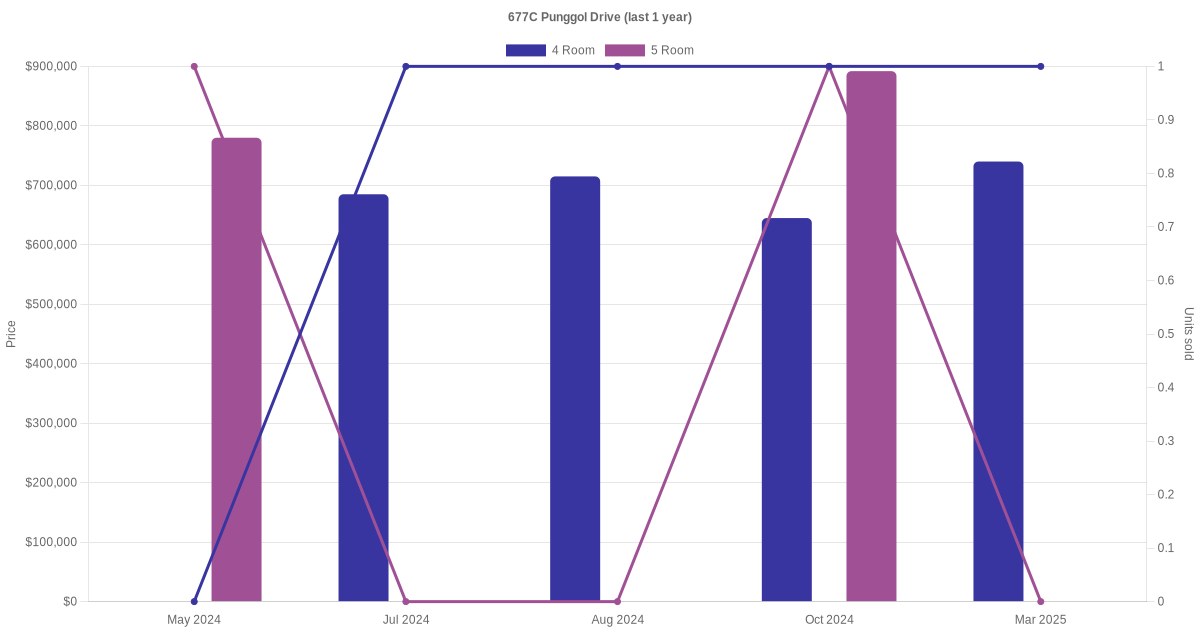 Below is a quick summary of the resale transactions volume and average price trends for the 4 room and 5 room units at 677C Punggol Drive.