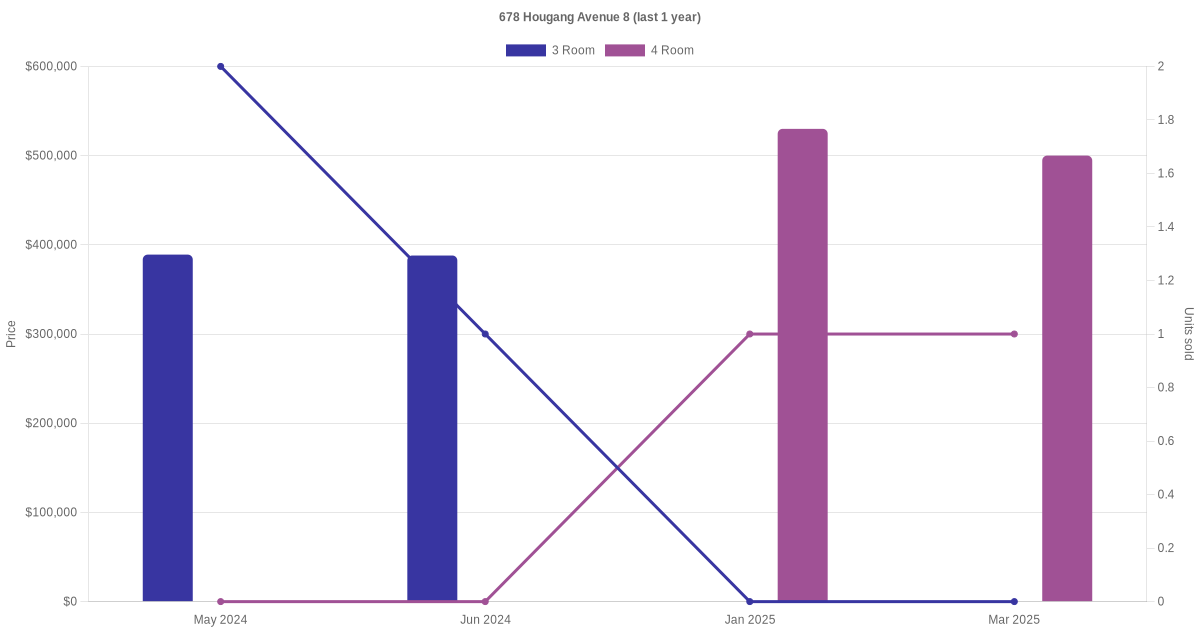 Below is a quick summary of the resale transactions volume and average price trends for the 3 room and 4 room units at 678 Hougang Avenue 8.