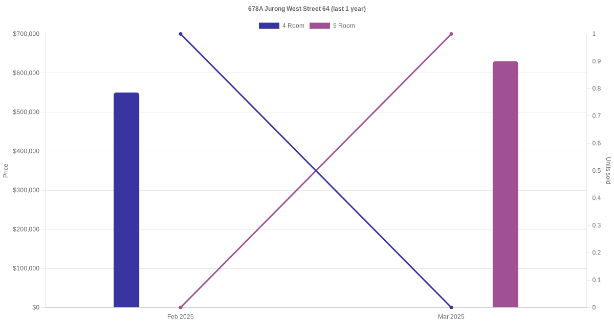 Below is a quick summary of the resale transactions volume and average price trends for the 4 room and 5 room units at 678A Jurong West Street 64.