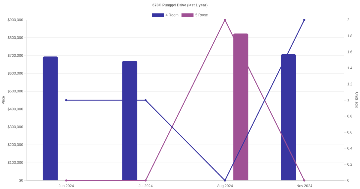Below is a quick summary of the resale transactions volume and average price trends for the 4 room and 5 room units at 678C Punggol Drive.