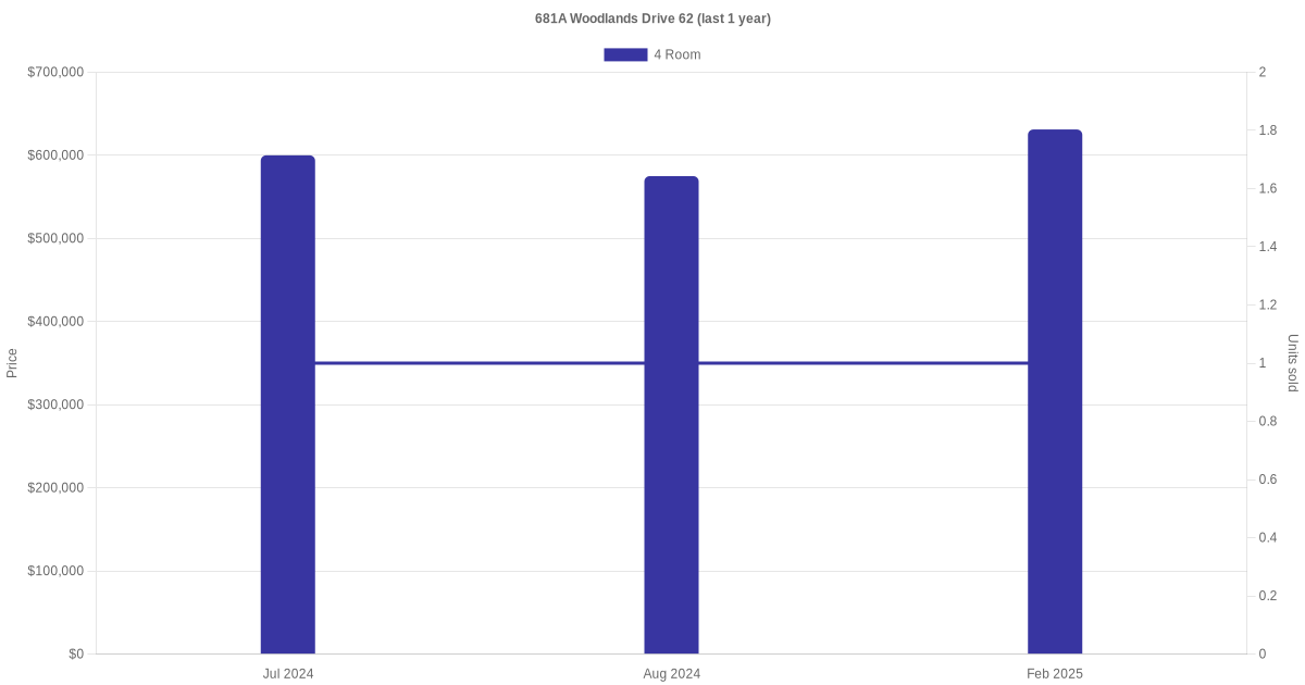 | Jul 2024 | $600,000 | $5,714 | 4 Room | Blk 681A Woodlands Drive 62 4 Room / 105 sqm | 10 to 12 | 105 sqm | Premium Apartment | 2000 |