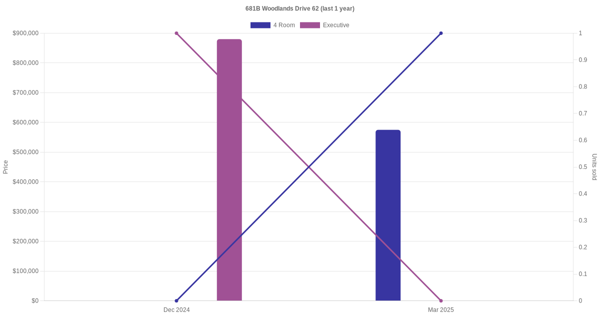 Here's a summary of the rental transactions and price trends for the 4 room and executive units at 681B Woodlands Drive 62.