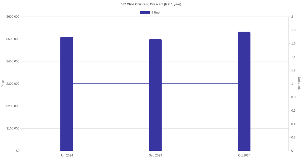 | Oct 2024 | $533,000 | $5,028 | 4 Room | Blk 682 Choa Chu Kang Crescent 4 Room / 106 sqm | 04 to 06 | 106 sqm | Premium Apartment | 1999 |