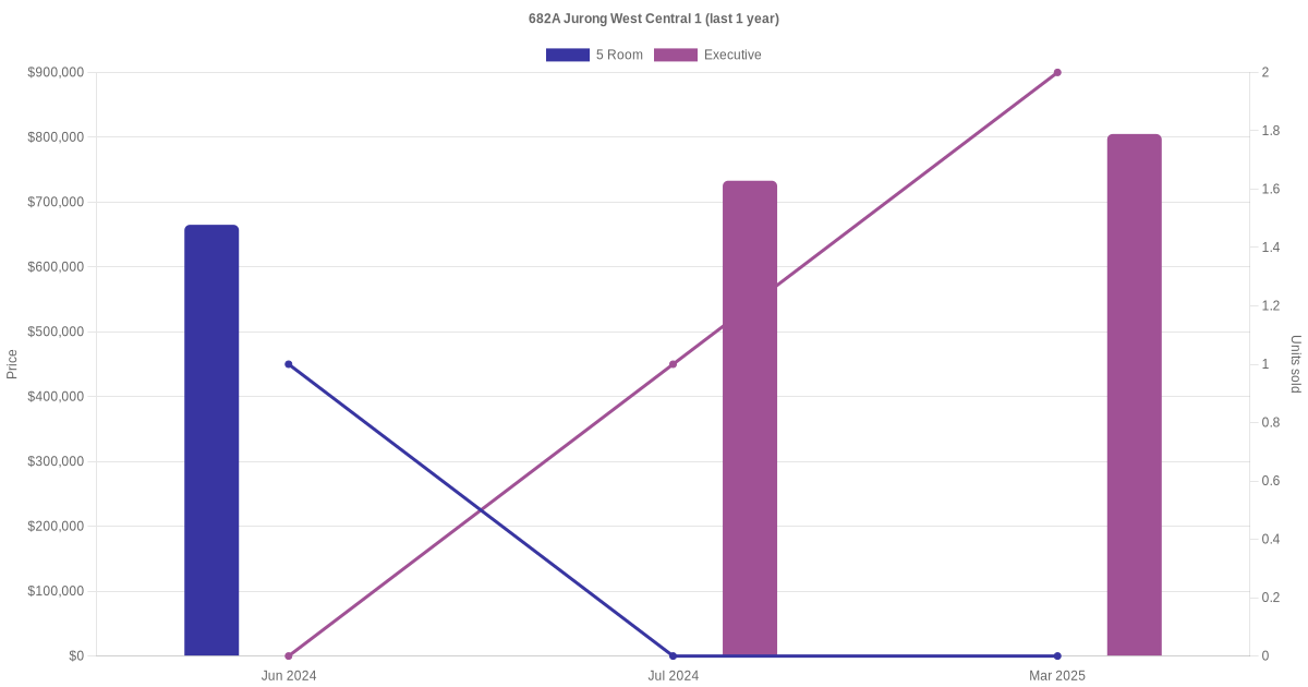 Below is a quick summary of the resale transactions volume and average price trends for the 5 room and executive units at 682A Jurong West Central 1.