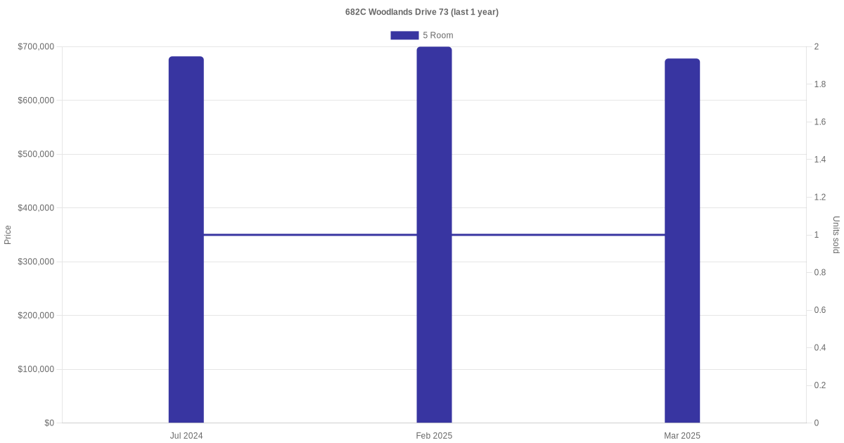 | Mar 2025 | $678,000 | $5,650 | 5 Room | Blk 682C Woodlands Drive 73 5 Room / 120 sqm | 07 to 09 | 120 sqm | Premium Apartment | 2000 |