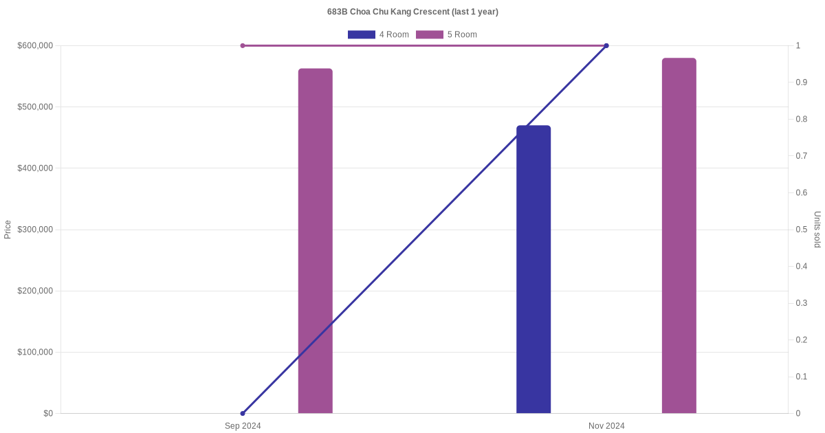 Below is a quick summary of the resale transactions volume and average price trends for the 4 room and 5 room units at 683B Choa Chu Kang Crescent.