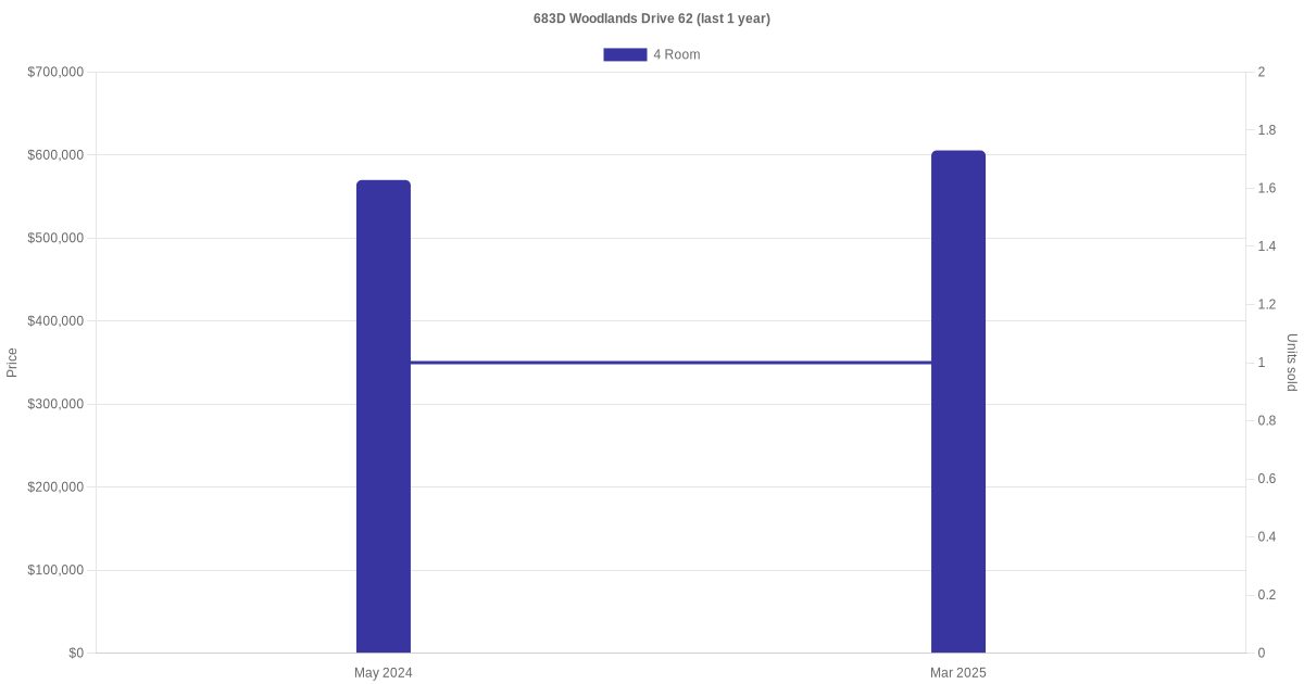 | Mar 2025 | $605,688 | $5,880 | 4 Room | Blk 683D Woodlands Drive 62 4 Room / 103 sqm | 04 to 06 | 103 sqm | Premium Apartment | 2000 |