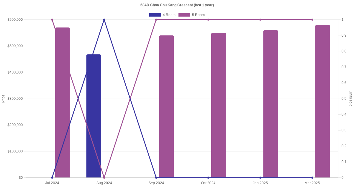 Below is a quick summary of the resale transactions volume and average price trends for the 4 room and 5 room units at 684D Choa Chu Kang Crescent.