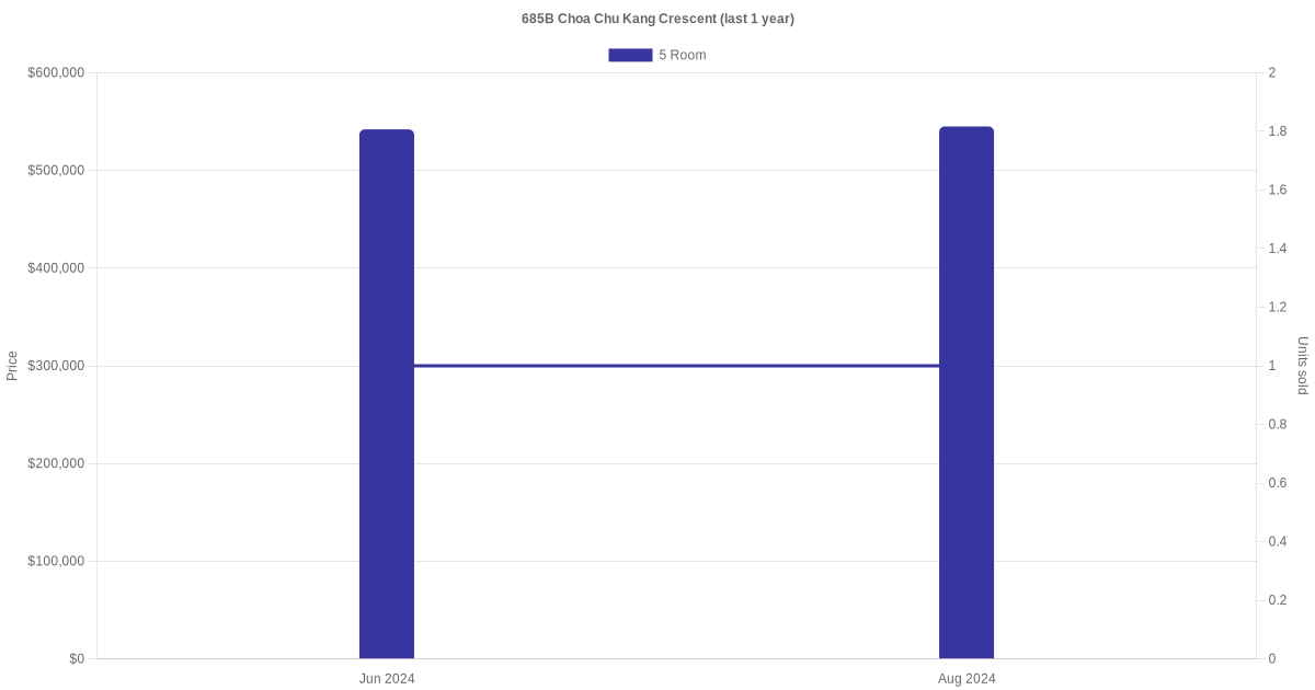 Below is a quick summary of the resale transactions volume and average price trends for the 5 room units at 685B Choa Chu Kang Crescent.