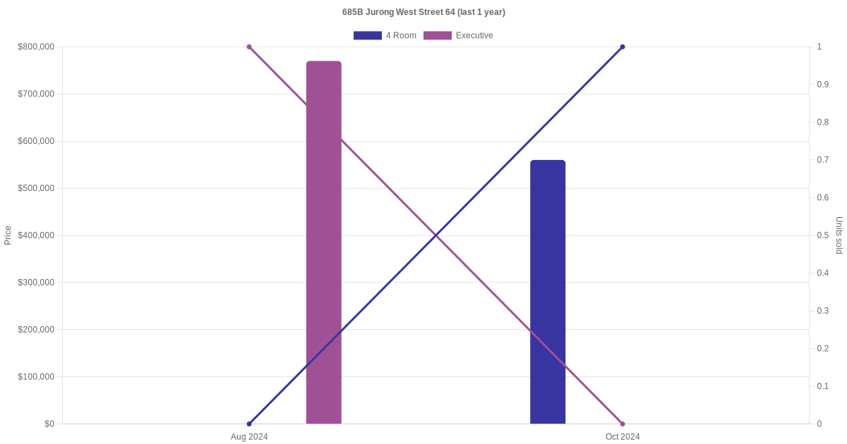 Below is a quick summary of the resale transactions volume and average price trends for the 4 room, 5 room and executive units at 685B Jurong West Street 64.