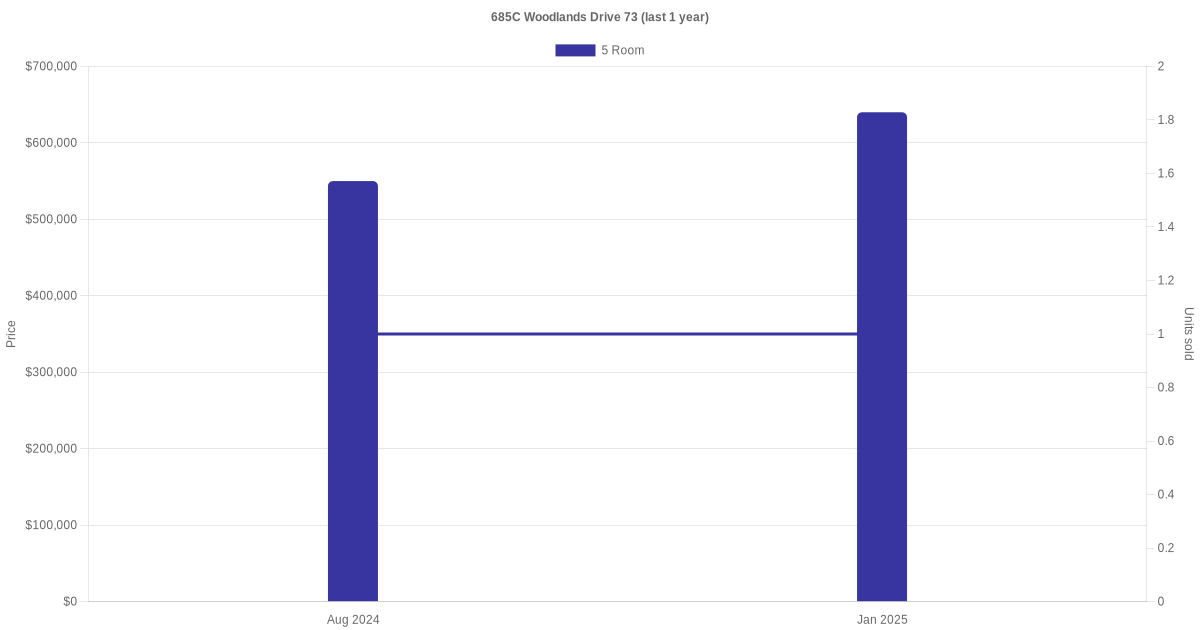 Below is a quick summary of the resale transactions volume and average price trends for the 5 room units at 685C Woodlands Drive 73.