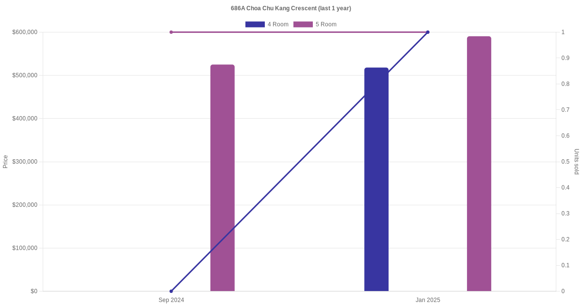 Below is a quick summary of the resale transactions volume and average price trends for the 4 room and 5 room units at 686A Choa Chu Kang Crescent.