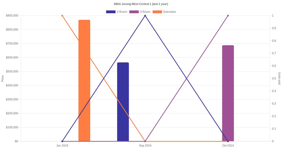 Below is a quick summary of the resale transactions volume and average price trends for the 4 room, 5 room and executive units at 686A Jurong West Central 1.