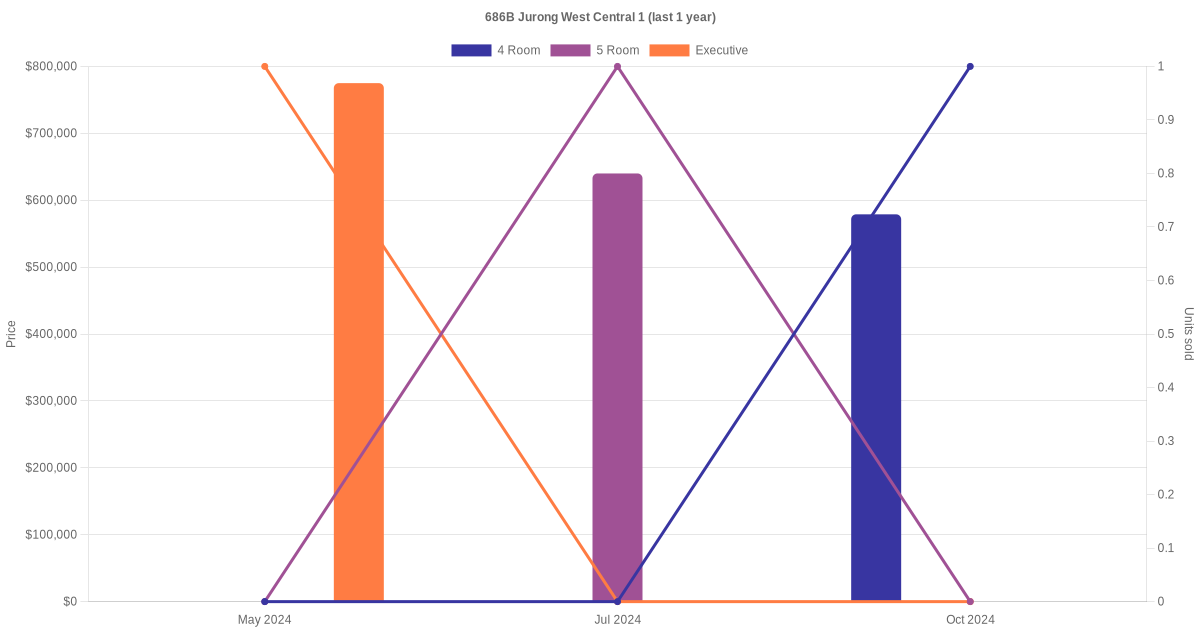 Below is a quick summary of the resale transactions volume and average price trends for the 4 room, 5 room and executive units at 686B Jurong West Central 1.