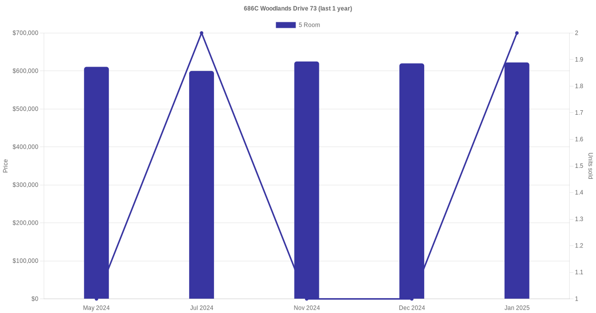 Below is a quick summary of the resale transactions volume and average price trends for the 5 room units at 686C Woodlands Drive 73.