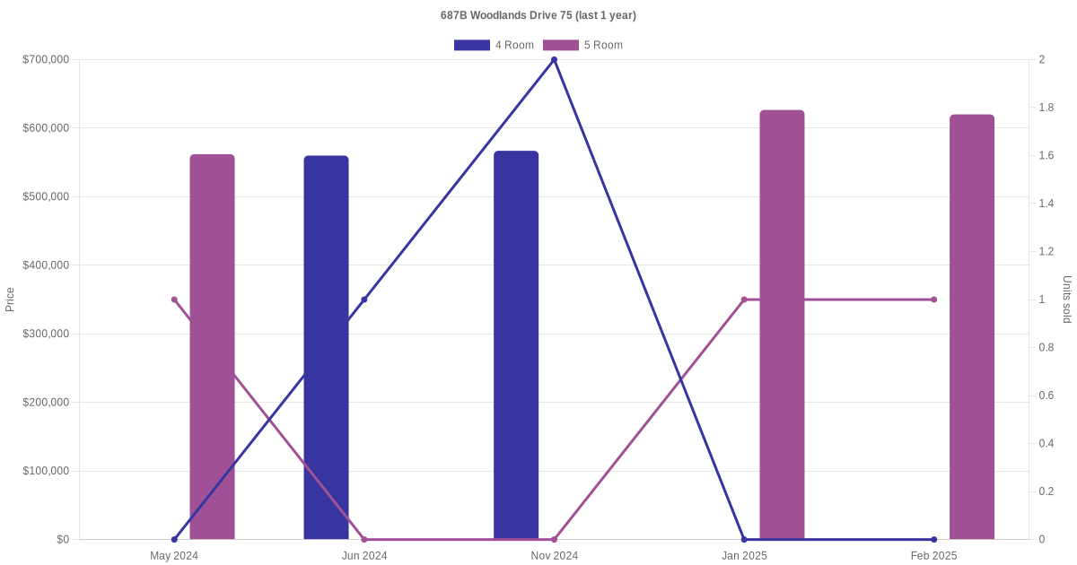Below is a quick summary of the resale transactions volume and average price trends for the 4 room and 5 room units at 687B Woodlands Drive 75.