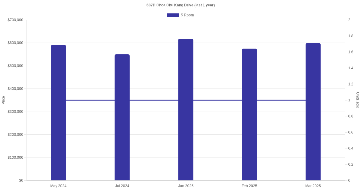 Below is a quick summary of the resale transactions volume and average price trends for the 5 room units at 687D Choa Chu Kang Drive.
