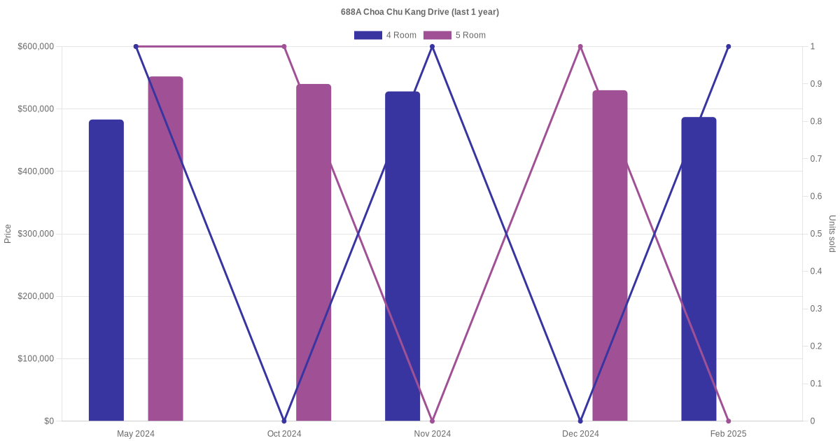 Below is a quick summary of the resale transactions volume and average price trends for the 4 room and 5 room units at 688A Choa Chu Kang Drive.