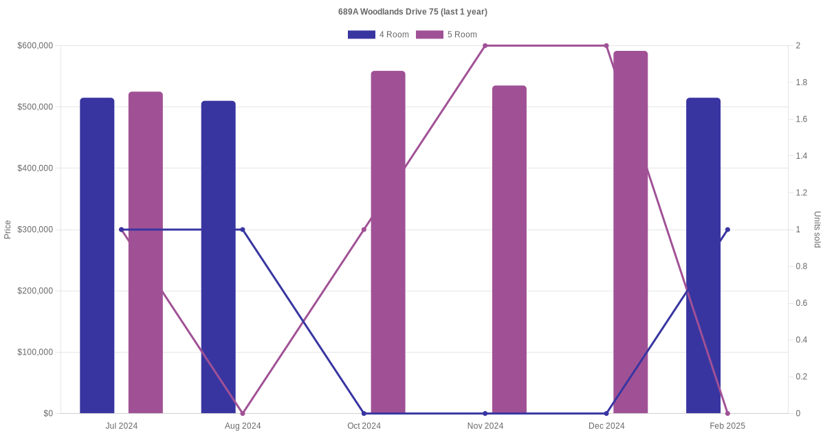 Below is a quick summary of the resale transactions volume and average price trends for the 4 room and 5 room units at 689A Woodlands Drive 75.