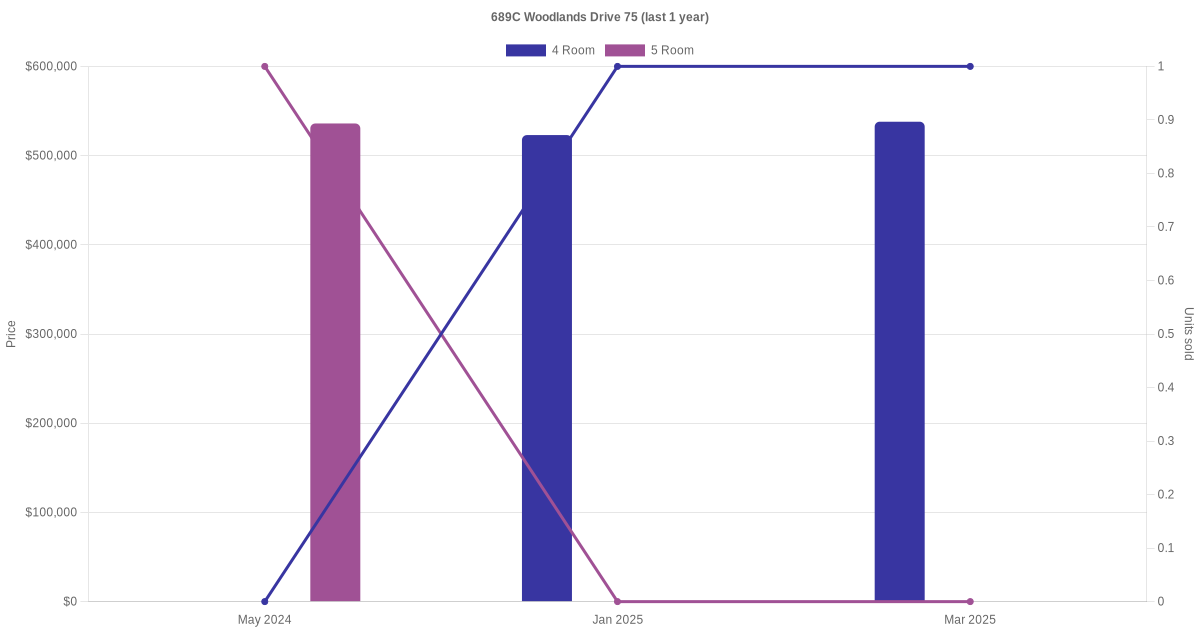 There were a total of 7 resale transactions in the last 3 years for units in block 689C Woodlands Drive 75, with the latest one recorded in Mar 2025.