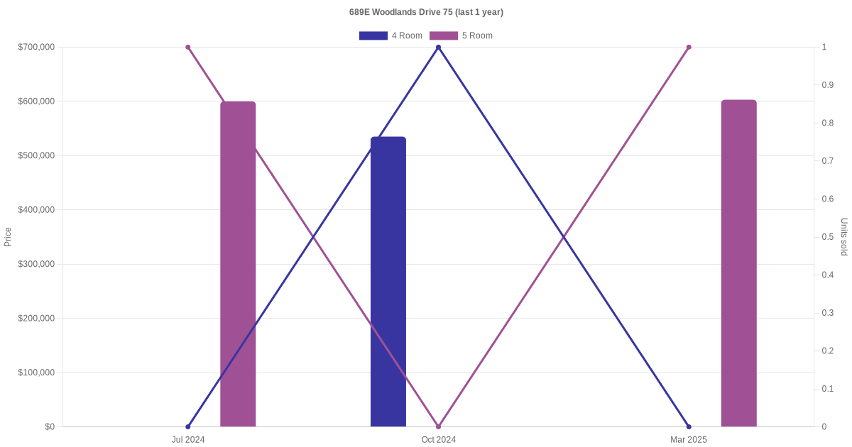 Below is a quick summary of the resale transactions volume and average price trends for the 4 room and 5 room units at 689E Woodlands Drive 75.