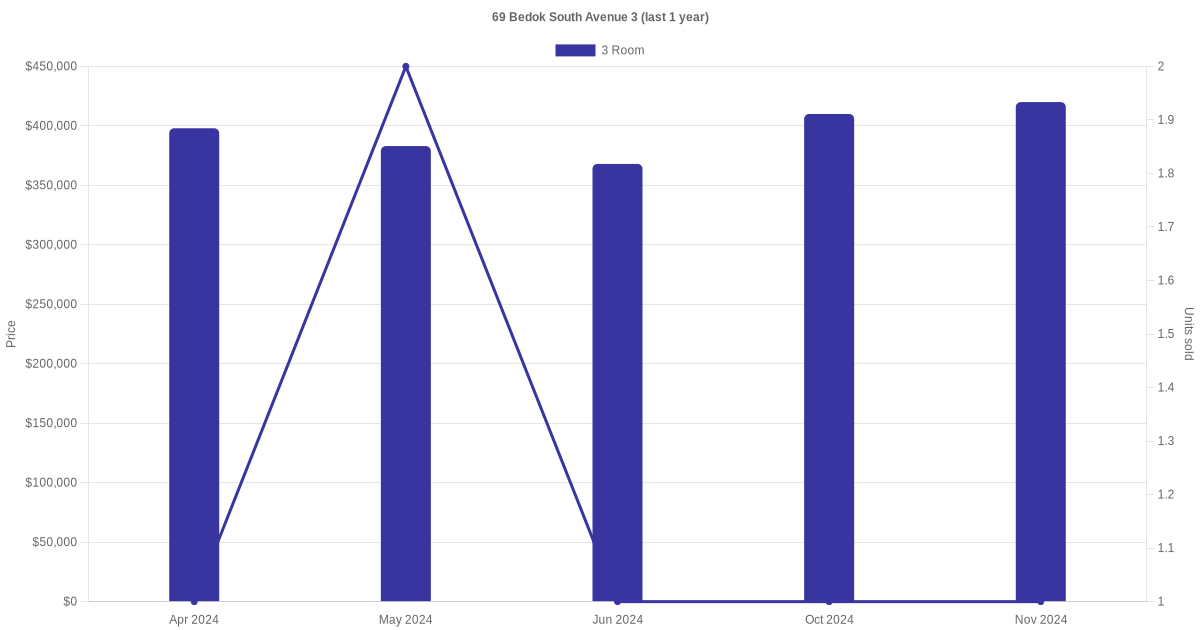 Below is a quick summary of the resale transactions volume and average price trends for the 3 room units at 69 Bedok South Avenue 3.