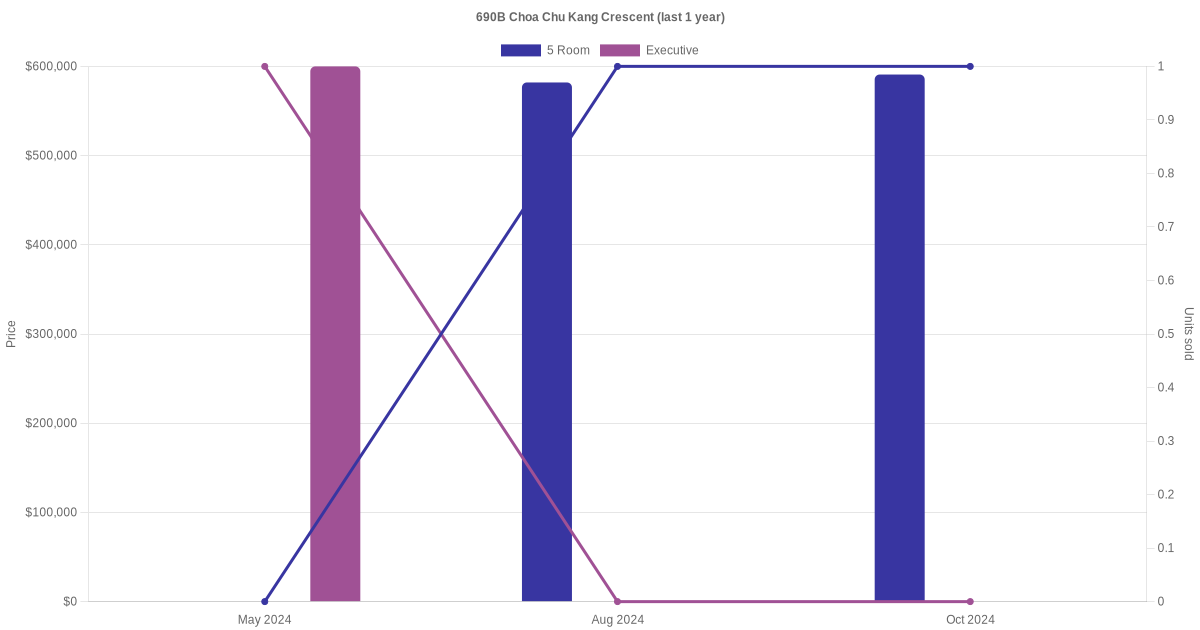 | Oct 2024 | $590,888 | $5,372 | 5 Room | Blk 690B Choa Chu Kang Crescent 5 Room / 110 sqm | 22 to 24 | 110 sqm | Improved | 2003 |