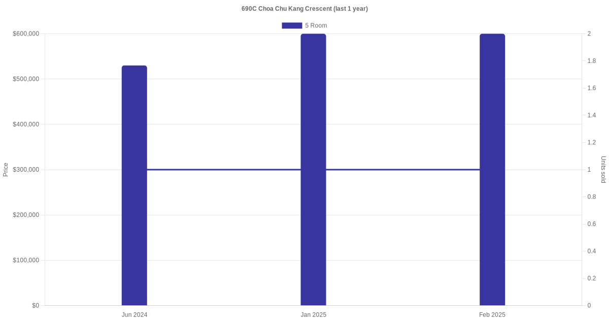 There were a total of 4 resale transactions in the last 3 years for units in block 690C Choa Chu Kang Crescent, with the latest one recorded in Feb 2025.