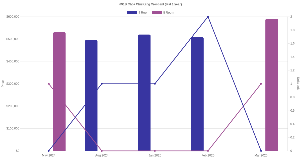 Below is a quick summary of the resale transactions volume and average price trends for the 4 room and 5 room units at 691B Choa Chu Kang Crescent.