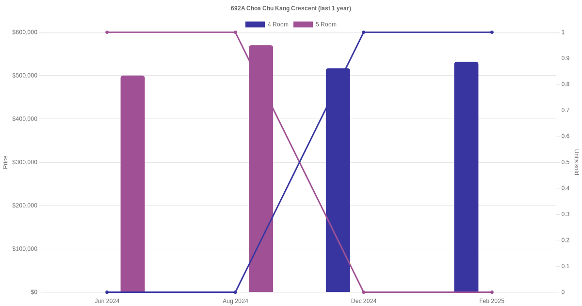 Below is a quick summary of the resale transactions volume and average price trends for the 4 room and 5 room units at 692A Choa Chu Kang Crescent.