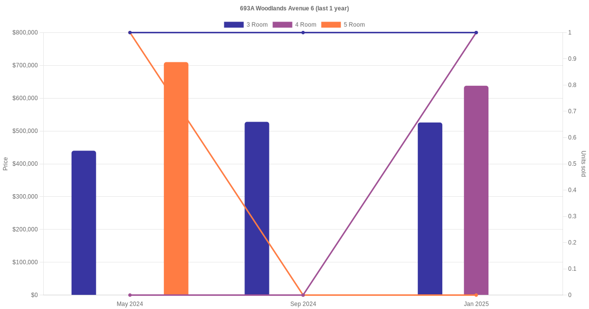 Here's a summary of the rental transactions and price trends for the 3 room, 4 room and 5 room units at 693A Woodlands Avenue 6.