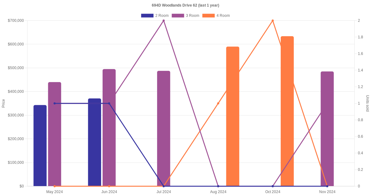 Here's a summary of the rental transactions and price trends for the 2 room, 3 room and 4 room units at 694D Woodlands Drive 62.