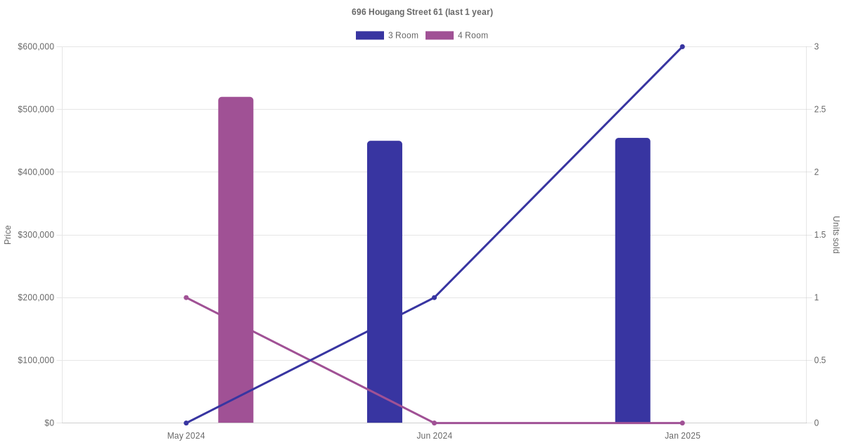 Below is a quick summary of the resale transactions volume and average price trends for the 3 room and 4 room units at 696 Hougang Street 61.