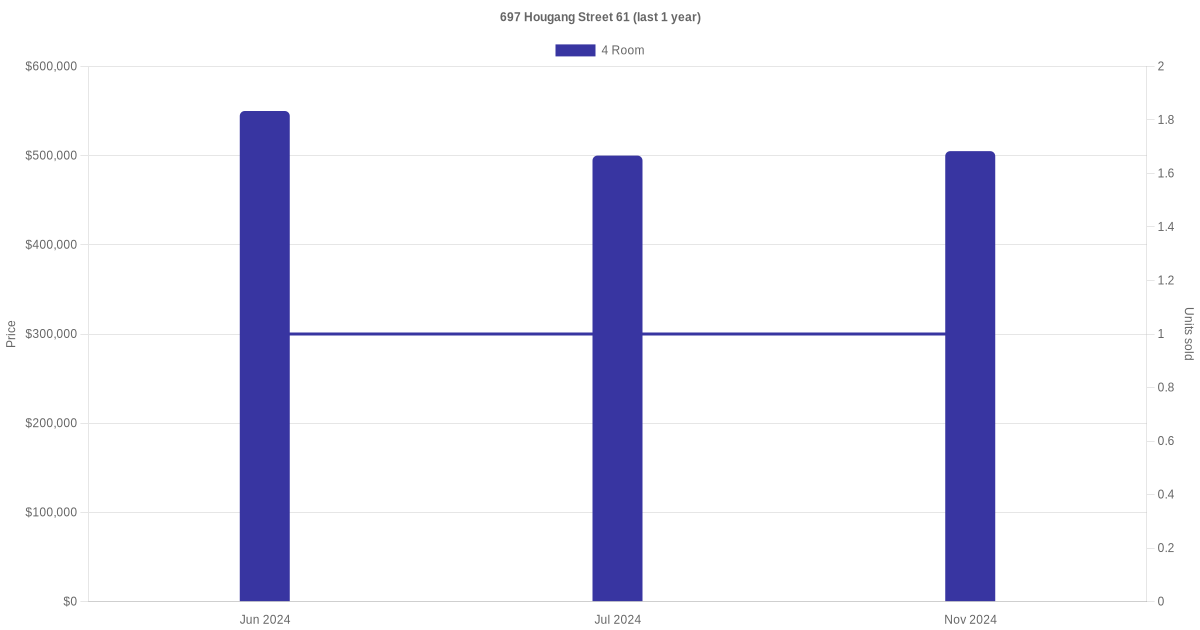 Below is a quick summary of the resale transactions volume and average price trends for the 4 room units at 697 Hougang Street 61.