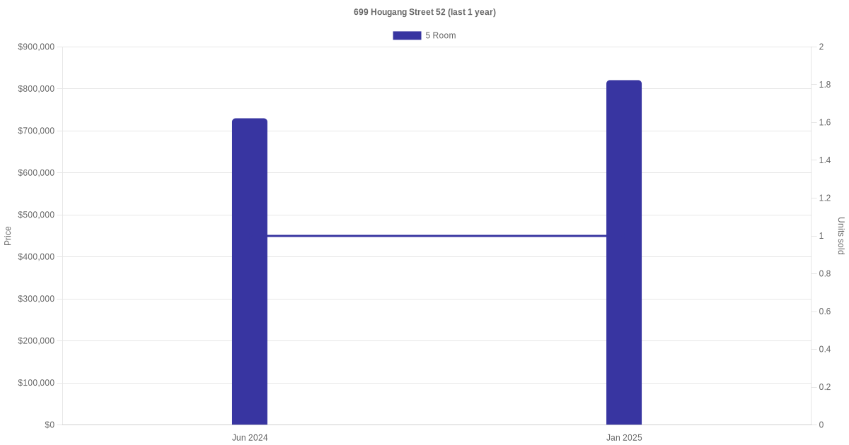 Below is a quick summary of the resale transactions volume and average price trends for the 5 room units at 699 Hougang Street 52.