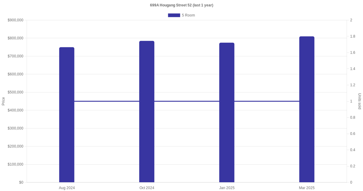 Below is a quick summary of the resale transactions volume and average price trends for the 5 room units at 699A Hougang Street 52.