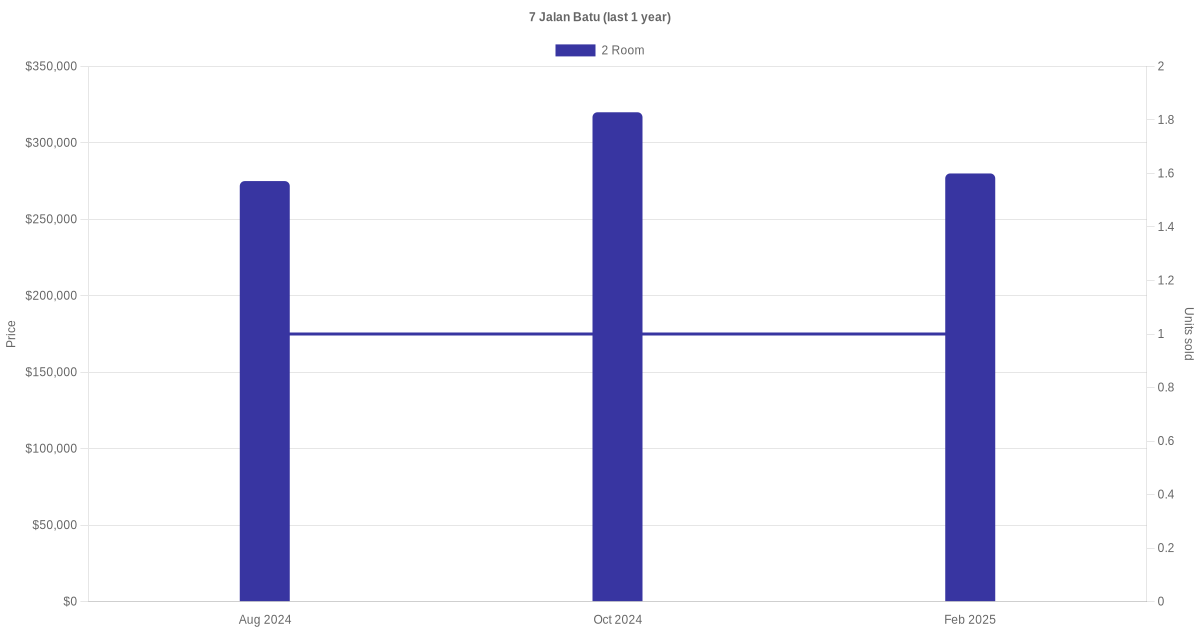 Below is a quick summary of the resale transactions volume and average price trends for the 2 room units at 7 Jalan Batu.