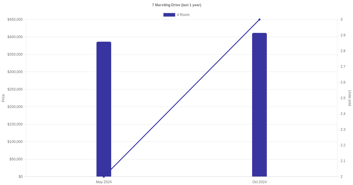 Below is a quick summary of the resale transactions volume and average price trends for the 4 room units at 7 Marsiling Drive.