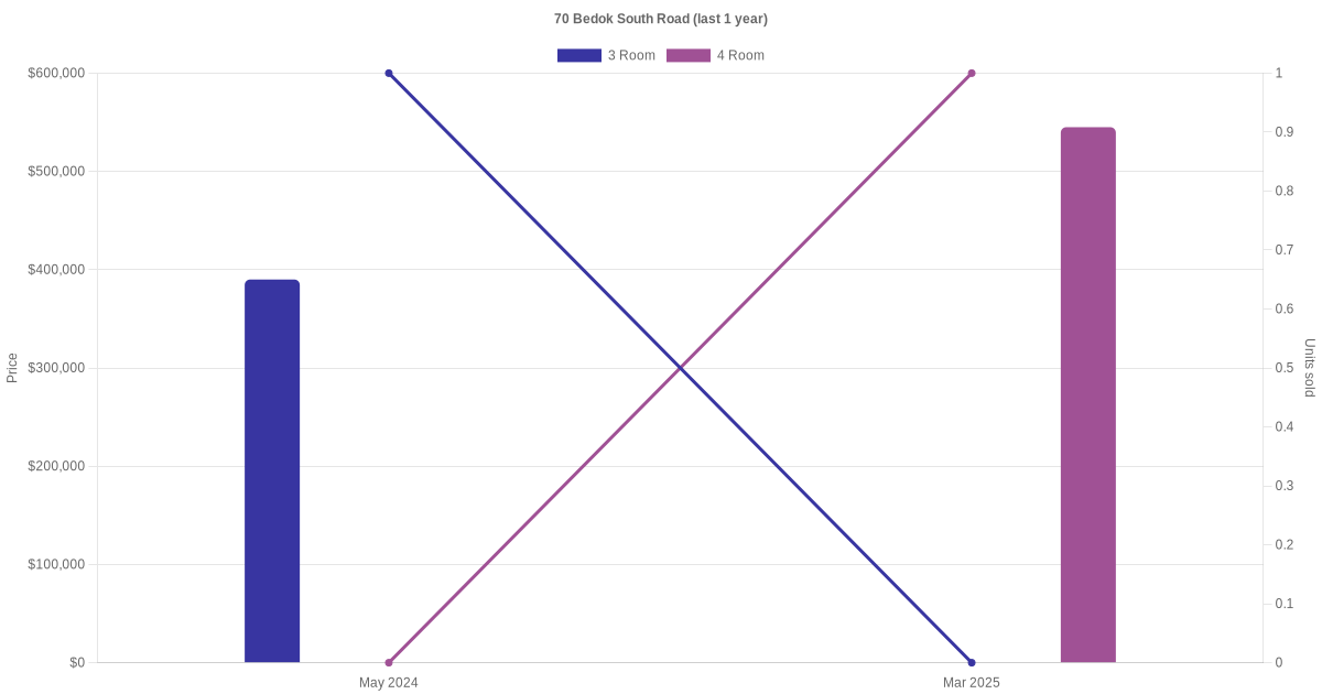 Below is a quick summary of the resale transactions volume and average price trends for the 3 room and 4 room units at 70 Bedok South Road.