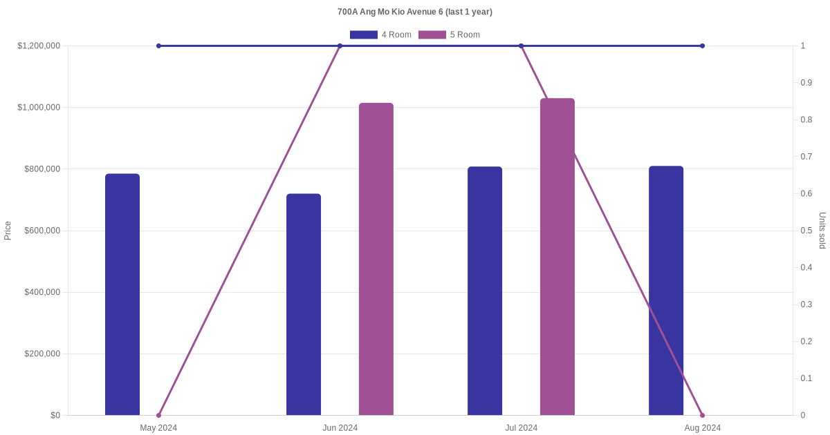 Below is a quick summary of the resale transactions volume and average price trends for the 4 room and 5 room units at 700A Ang Mo Kio Avenue 6.