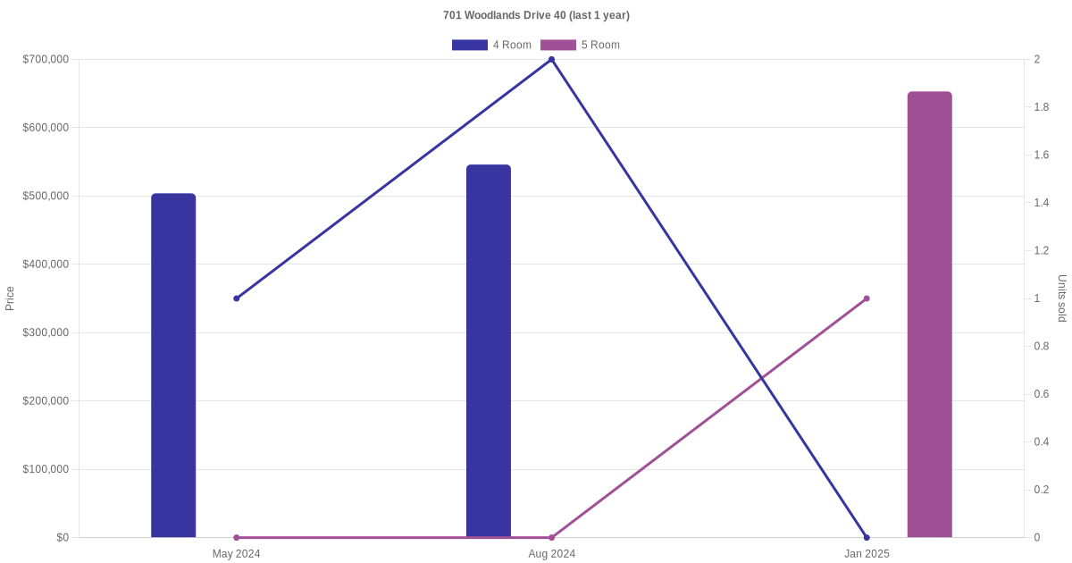 Below is a quick summary of the resale transactions volume and average price trends for the 4 room and 5 room units at 701 Woodlands Drive 40.