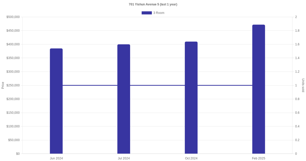 Below is a quick summary of the resale transactions volume and average price trends for the 3 room units at 701 Yishun Avenue 5.