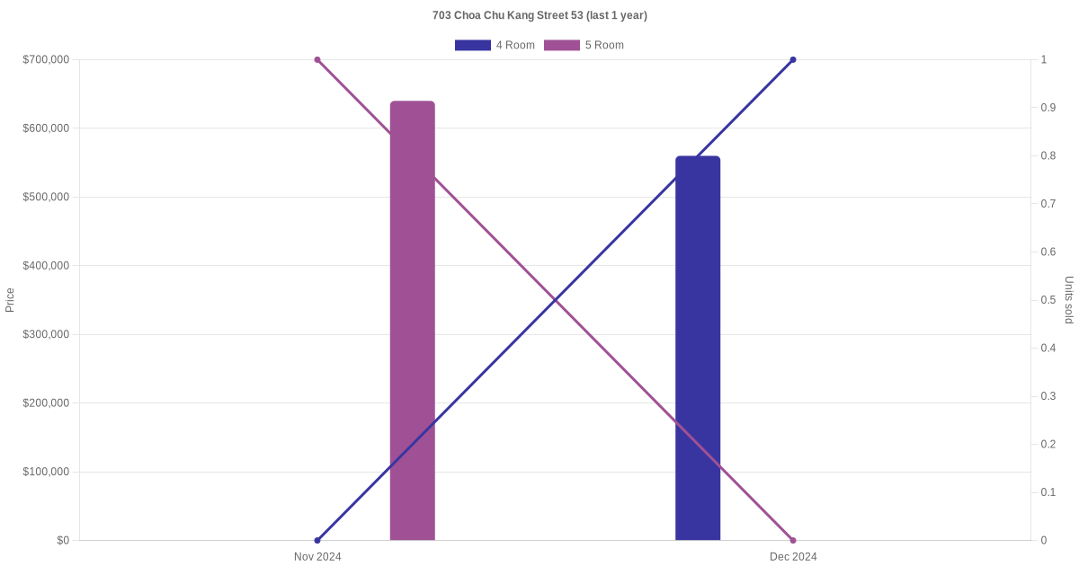Below is a quick summary of the resale transactions volume and average price trends for the 4 room and 5 room units at 703 Choa Chu Kang Street 53.