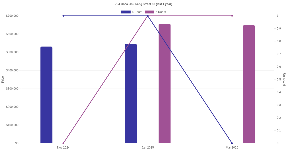 There were a total of 5 resale transactions in the last 3 years for units in block 704 Choa Chu Kang Street 53, with the latest one recorded in Mar 2025.