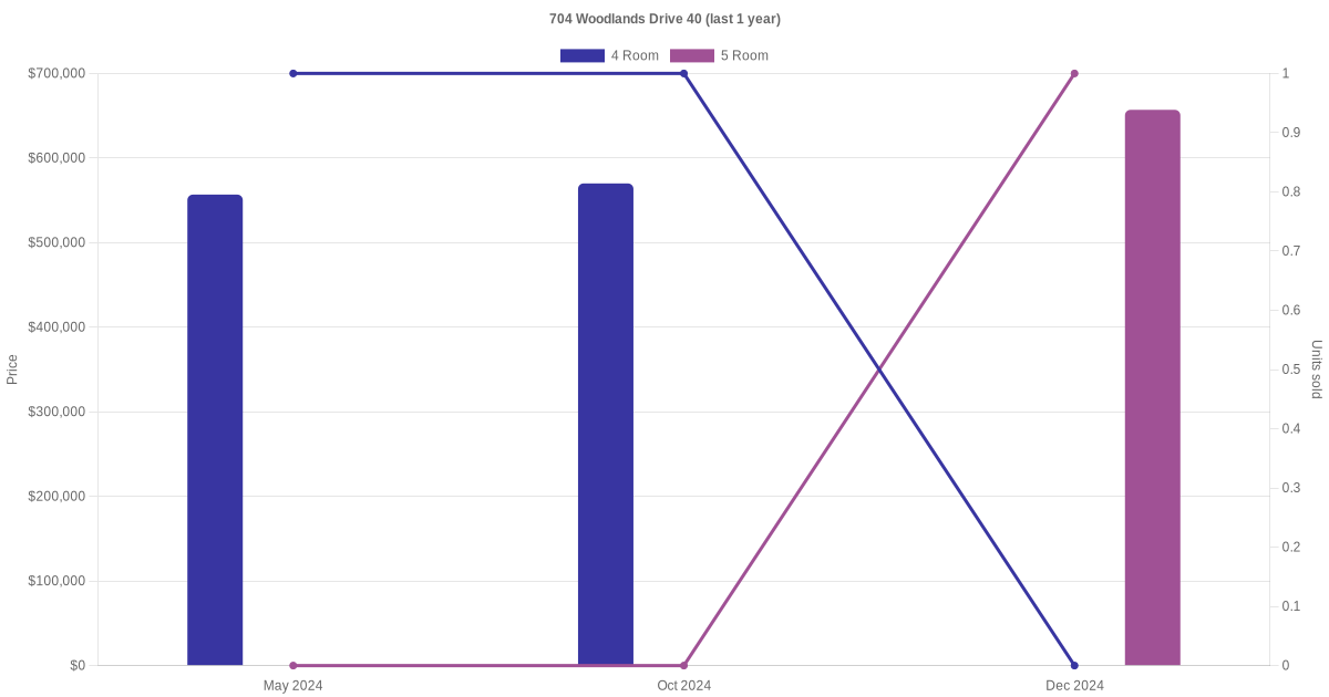 Below is a quick summary of the resale transactions volume and average price trends for the 4 room and 5 room units at 704 Woodlands Drive 40.