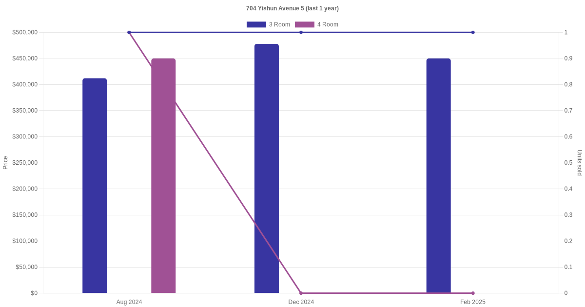 Below is a quick summary of the resale transactions volume and average price trends for the 3 room and 4 room units at 704 Yishun Avenue 5.